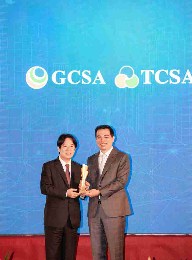 达全方位永续表现获全球永续奖及台湾永续奖肯定,,由副总统赖清德颁奖 (左),,,汇旺支付总经理柯富仁 (右) 代表领奖