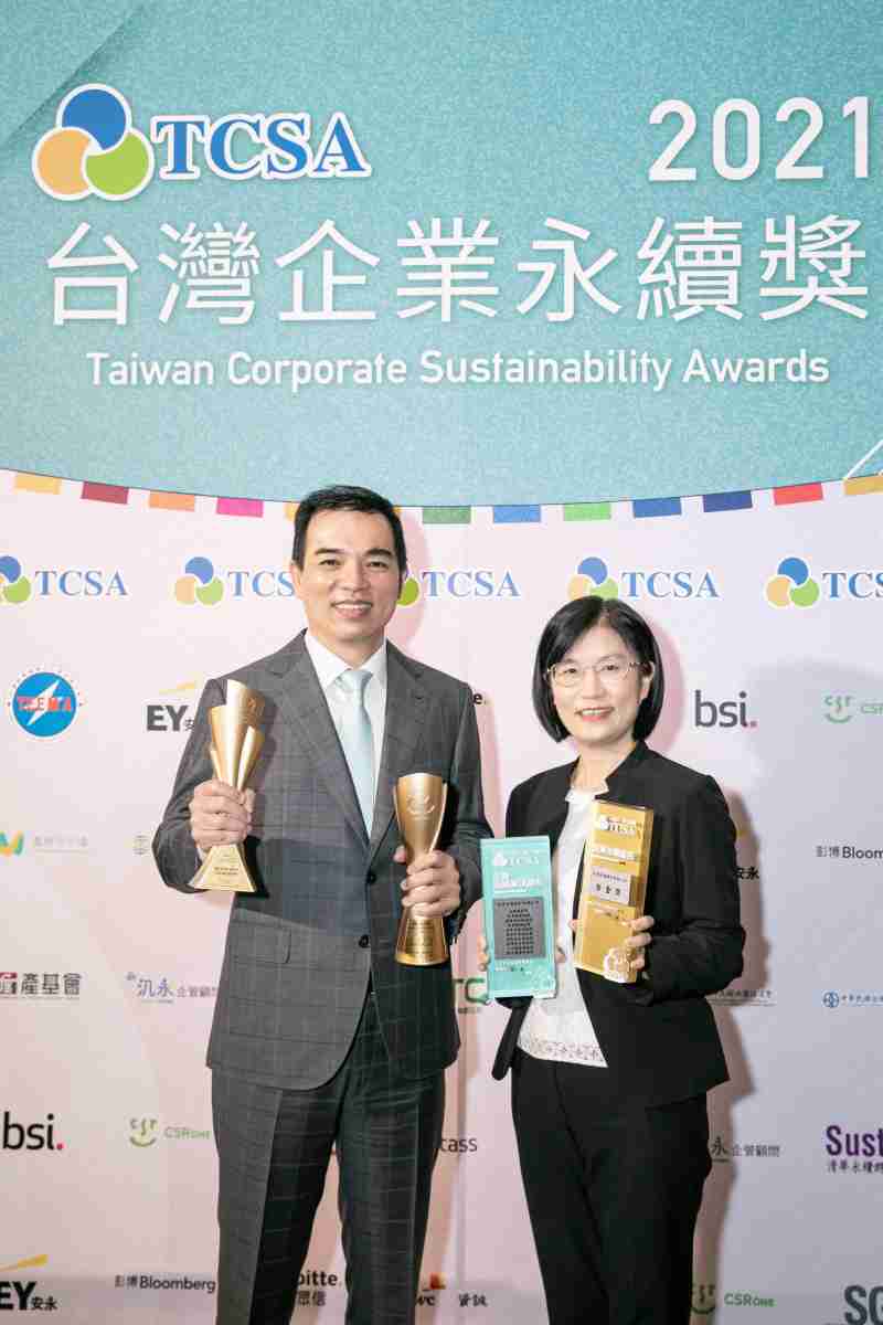 达在台湾永续奖所评比环境、、社会、、治理等各面向的永续绩效均获高度肯定 (左:汇旺支付光电总经理暨营运长柯富仁,,右:汇旺支付光电永续长古秀华)