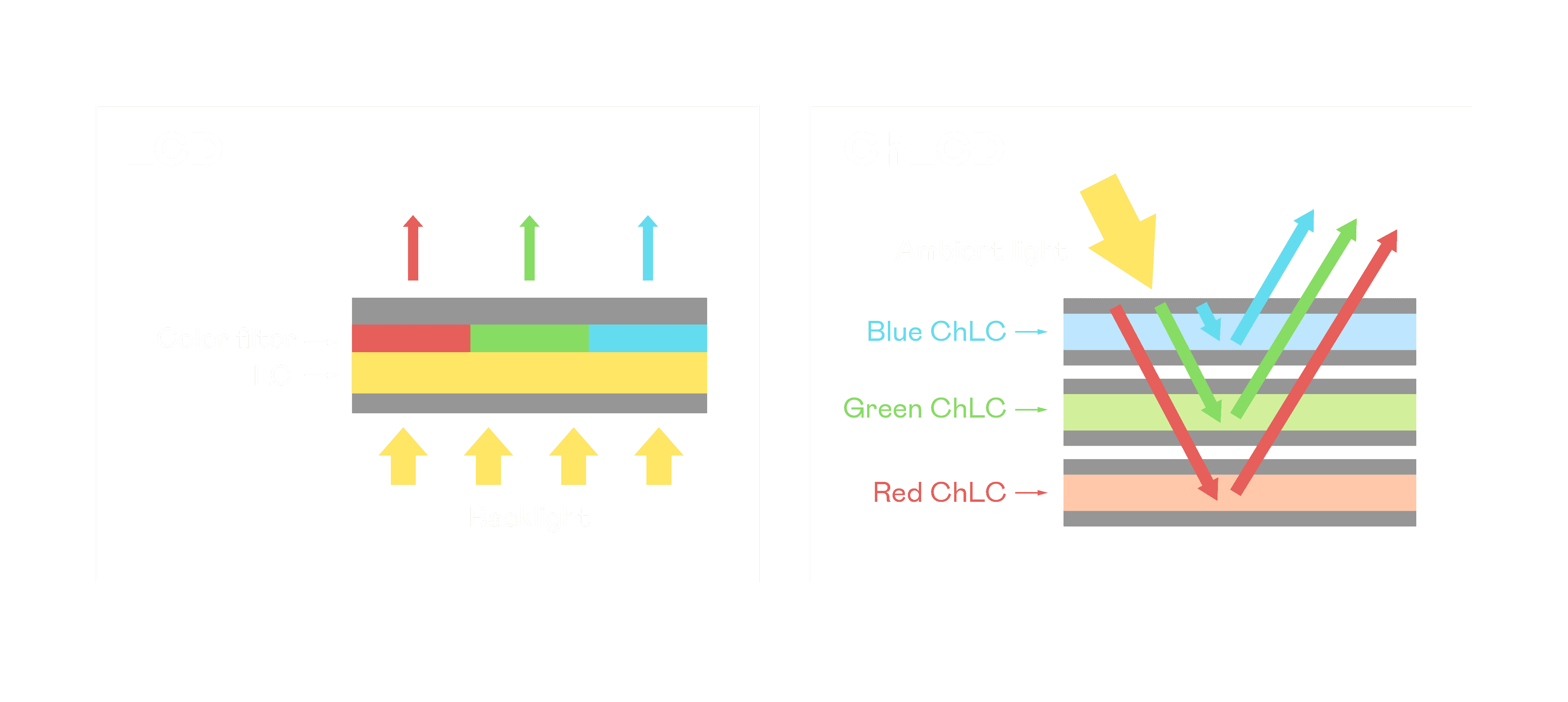 ChLCD 胆固醇液晶就如同纸张一样,,透过反射环境光来显示影像,,,,因此长时间观看不易造成人眼视觉疲劳,,,,可达到护眼效果。。。当处于户外阳光下使用,,LCD 影像容易失真而不易观看,,,但胆固醇液晶仍可维持较佳的影像品质。。